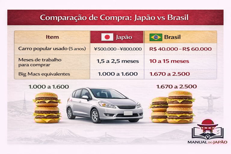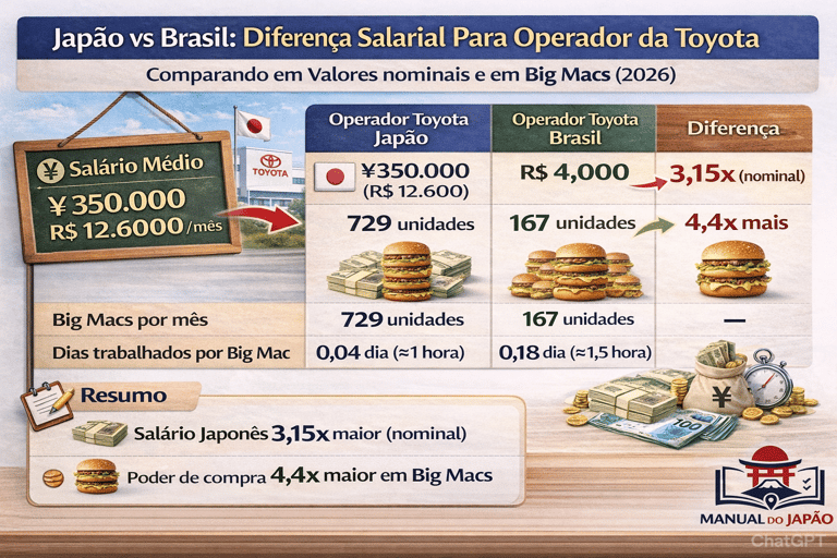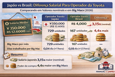 Comparação real do poder de compra entre um operador da Toyota no Japão e no Brasil usando o Índice Big Mac e exemplos práticos. Entenda quanto cada salário permite comprar nos dois países.