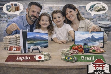 A mágica acontece porque: você ganha em ienes (moeda forte) e gasta em reais (moeda desvalorizada). O câmbio faz o papel de multiplicador do seu poder de compra.