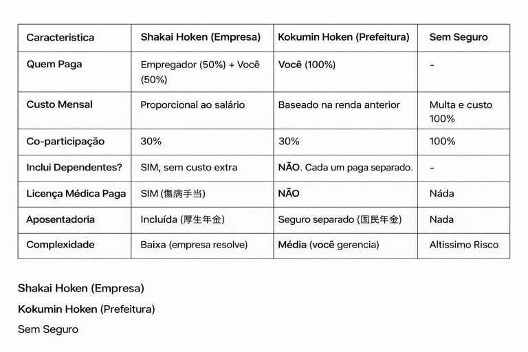 Grande Desvantagem: NÃO inclui automaticamente licença médica paga nem dependentes. Cada membro da família precisa de uma apólice separada, pagando valores individuais. Para uma família, o custo total pode ser muito superior ao do Shakai Hoken.